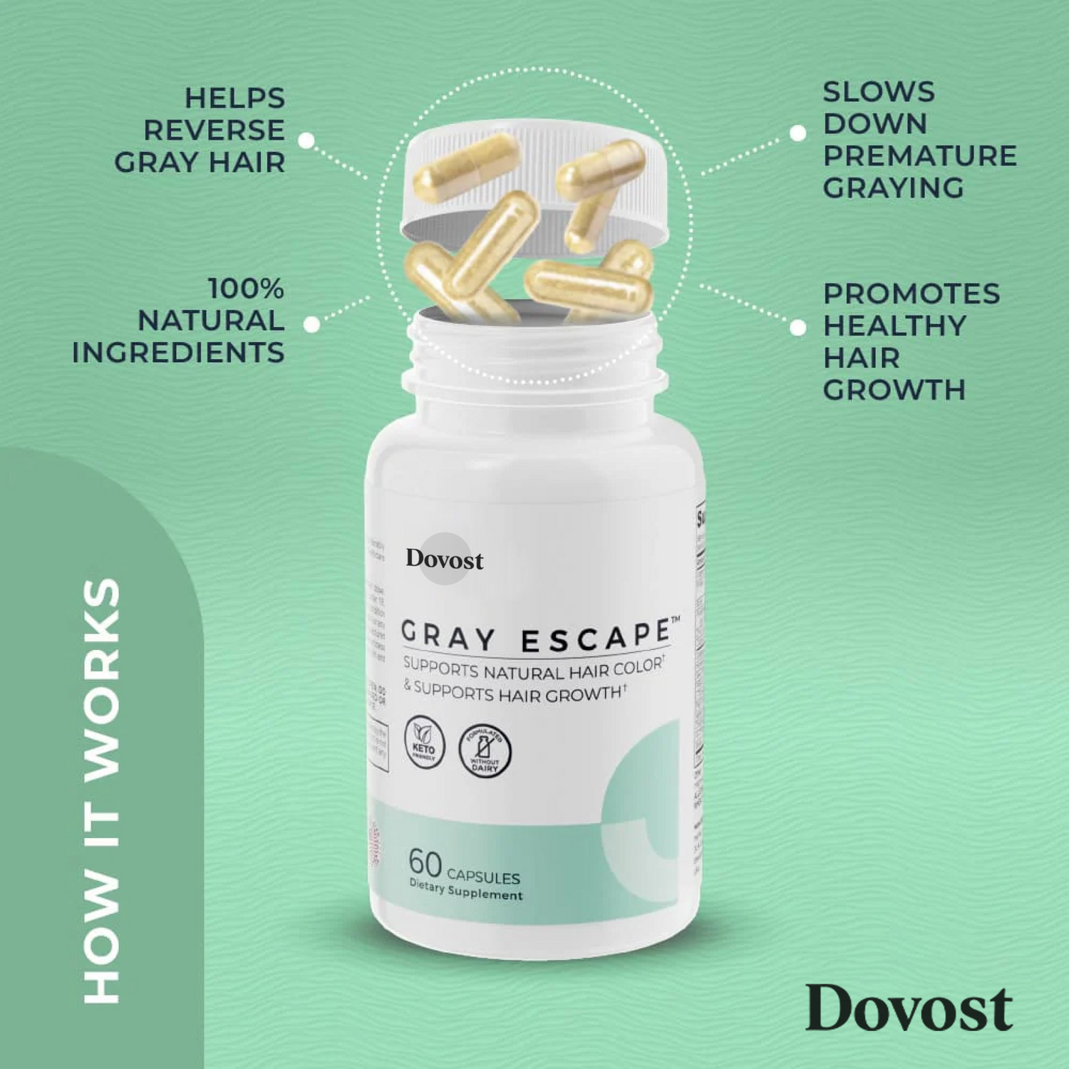 Gray Escape™ delivers an advanced anti-gray hair formula in one easy capsule. Packed with powerful vitamins, minerals, and antioxidants, it slows down the aging process and even re-pigments your gray hair.